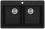EVIER DE SILGRANIT MODELE HORIZON 210 DOUBLE CUVE. SURFACE NON POREUSE RESISTANT A LA CHALEUR, ORIFICE DE VIDANGE DEPORTE VERS L'ARRIERE. CREPINES EN INOX INCLUSES. DIMENSION: 31-1/2PO X 20-1/2PO X 8PO COULEUR NOIR CHARBON